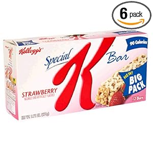 Category: Grocery & Gourmet Food Availability: Y 6 boxes of 12-count Special K Strawberry cereal bars Made from lightly toasted and crunchy rice and wheat flakes With bits of dried strawberry and a drizzle of creamy icing Only 90 calories in each bar to keep daily intake on track Great for on-the-go snacking or light dessert in a lunchbox